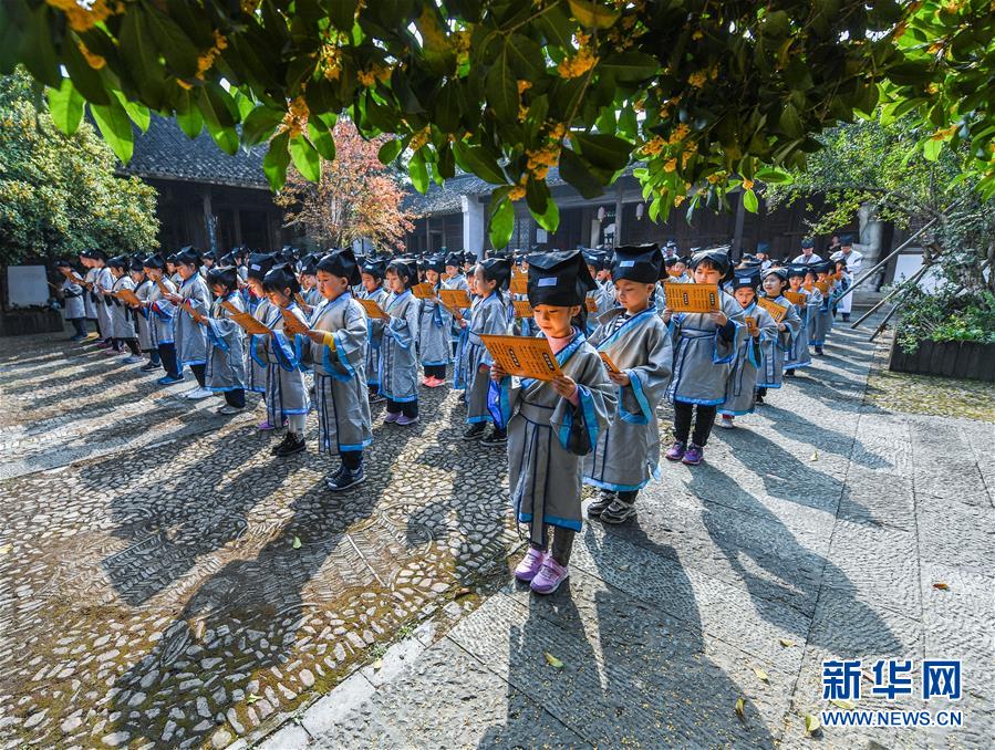 10月23日,學(xué)生們在老師的帶領(lǐng)下誦讀國學(xué)經(jīng)典。當(dāng)日,浙江省長興縣第八小學(xué)舉行“誦家規(guī)家訓(xùn),傳中華美德”校園“誠敬日”主題教育活動,通過誦讀國學(xué)經(jīng)典、講勵志故事、演美德戲劇等形式,讓學(xué)生感受優(yōu)秀傳統(tǒng)文化。近年來,該學(xué)校立足“誠敬”文化,注重國學(xué)啟蒙教育,讓學(xué)生從小培養(yǎng)“以誠立身、以敬處事”的良好品質(zhì)。新華社記者 徐昱 攝