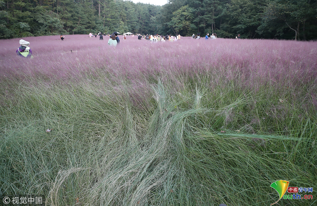 韓國蔚山,近日,蔚山公園大片粉黛亂子草盛開,但部分花海遭游客隨意踩踏。公園并沒有修復(fù)遭破壞區(qū)域,而是用繩索圍起并掛上批判性告示,呼吁游客腳下留情。圖片作者:Yonhap News Agency