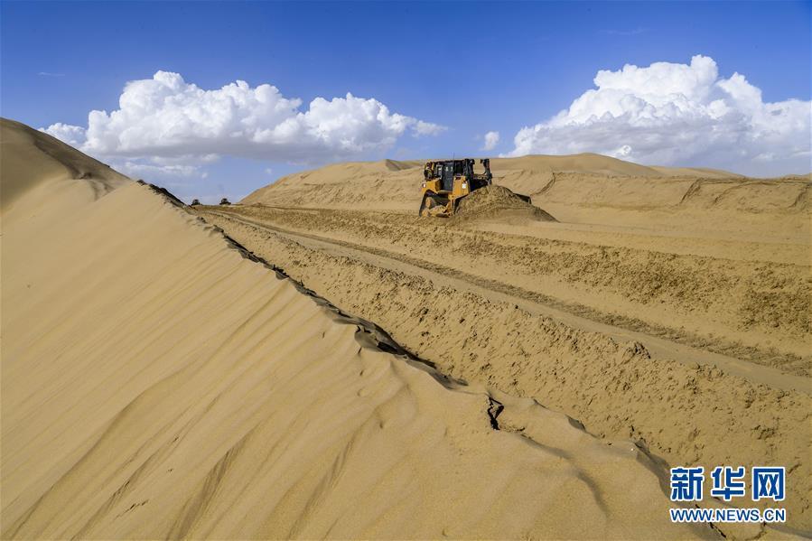這是建設中的新疆且末縣至尉犁縣的沙漠公路(7月5日攝)。新華社記者 胡虎虎 攝