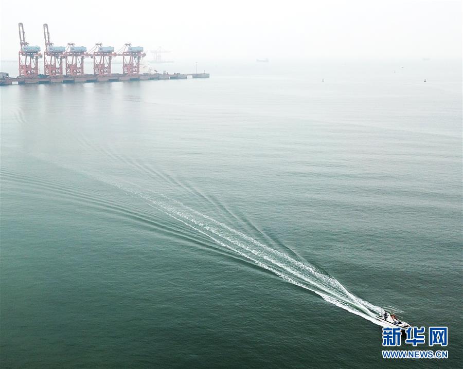 10月24日,一艘運輸貨物的快艇行駛在廣西防城港碼頭海域(無人機拍攝)。 新華社記者 魏海 攝