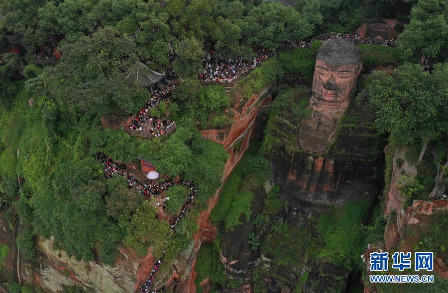 10月4日,游客在樂山大佛前排隊一睹大佛真容(無人機拍攝)?!⌒氯A社記者 江宏景 攝