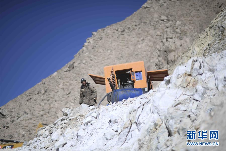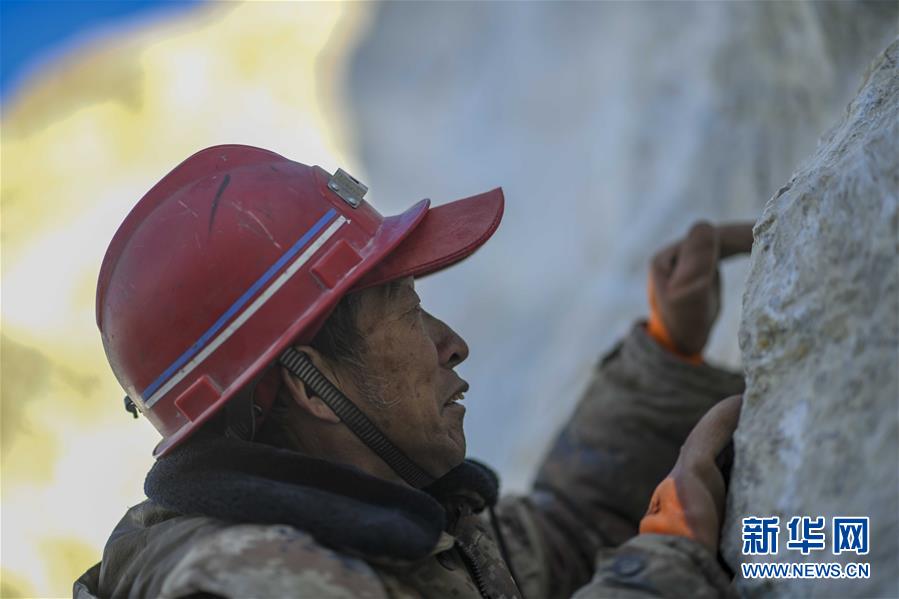 在昆侖山上海拔4000米的興發(fā)達(dá)玉礦,工程師田仲祥展示一塊正在開采的玉石礦體(10月23日攝)。 新華社記者武巍攝