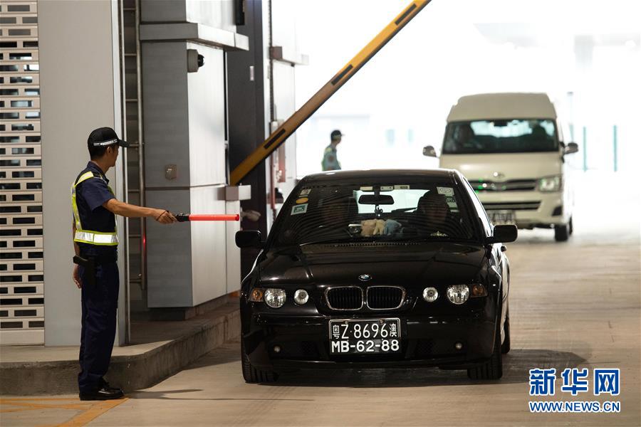 10月24日,首輛私家車在澳門口岸離境車道上通關(guān)。當(dāng)日9時,港珠澳大橋正式通車。 新華社記者張金加攝
