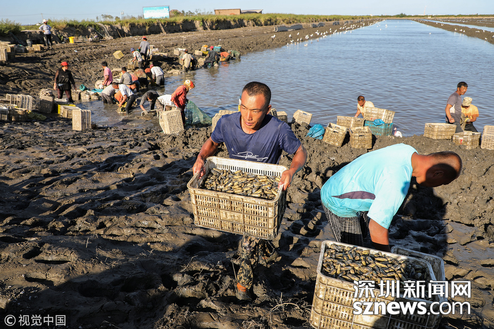 緊挨著黃海的大片養(yǎng)殖區(qū),因為一條濱海大道,被自然劃成南北兩個部分。挖蟶人從四面八方趕來,或集體包車、或自駕摩托。這些機動車密密地??吭跒I海大道一側(cè),綿延數(shù)公里。
