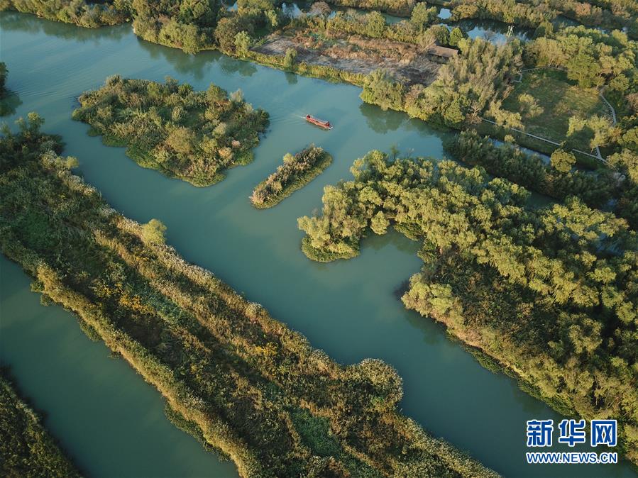 10月29日,游船行駛在西溪濕地河道上(無人機拍攝)。新華社記者翁忻旸攝