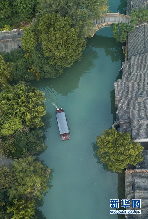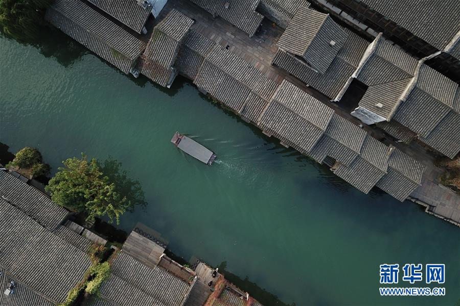 10月18日,一艘游船行駛在烏鎮(zhèn)水道上(無人機拍攝)。新華社記者翁忻旸攝