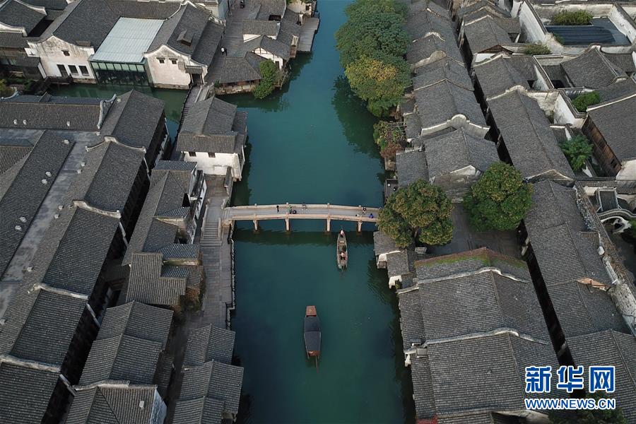 10月18日,游船行駛在烏鎮(zhèn)水道上(無人機拍攝)。新華社記者翁忻旸攝
