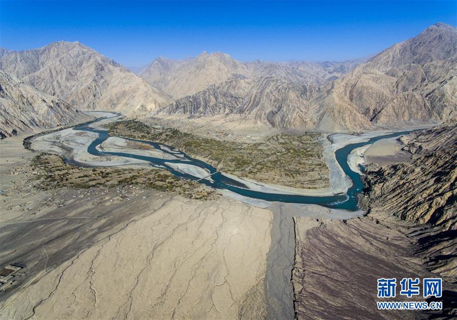 這是位于昆侖山深處的克孜勒蘇柯爾克孜自治州阿克陶縣庫斯拉甫鄉(xiāng),葉爾羌河從村莊流過(10月27日無人機拍攝)。 新華社記者 關(guān)俏俏 攝
