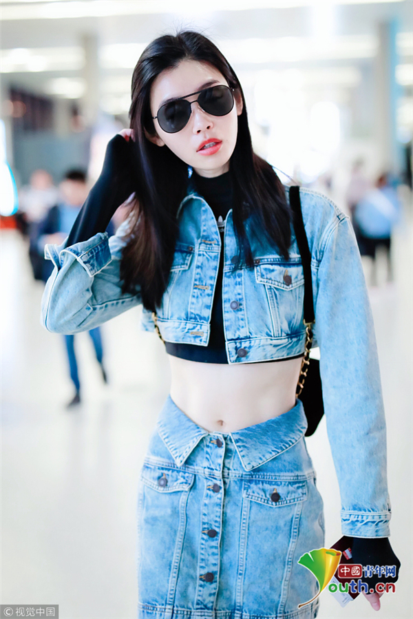 奚夢(mèng)瑤一身帥氣牛仔裝 露細(xì)腰長(zhǎng)腿顯好身材