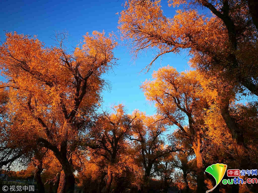 中國青年網(wǎng)北京10月9日電 2018年10月7日至8日,內(nèi)蒙古自治區(qū)阿拉善盟額濟(jì)納旗,地處巴丹吉林沙漠。額濟(jì)納河兩岸壯觀的胡楊林堪稱大漠的一顆綠色明珠,每年深秋時(shí)節(jié)的第一場秋霜過后,大片的胡楊樹葉由綠變黃,一眼望去,陽光下金色的樹葉襯著湛藍(lán)的天空于風(fēng)中婆娑起舞,鮮明的影調(diào),亮麗的色彩,令人流連忘返。
