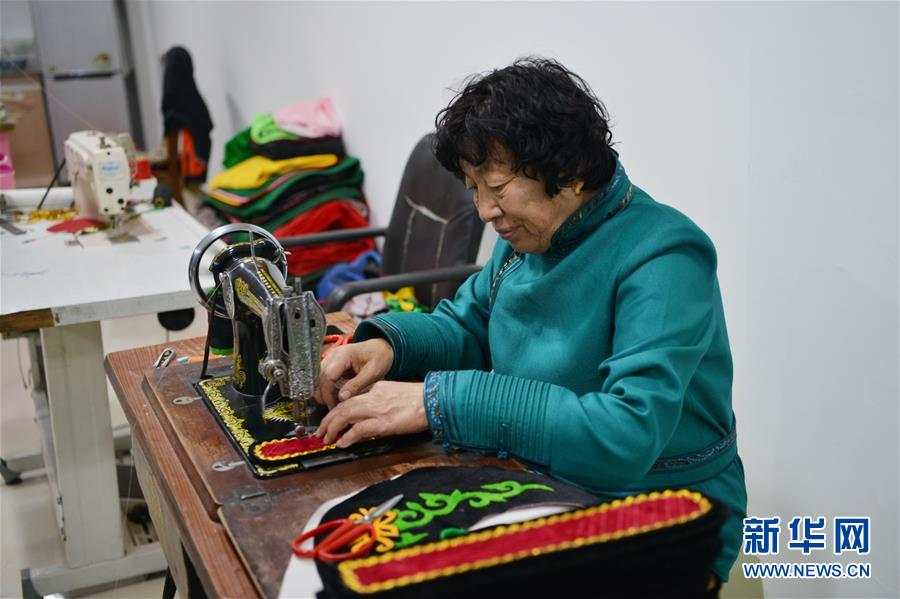 10月31日,在內(nèi)蒙古自治區(qū)通遼市市區(qū),套格敦白乙的妻子娜日在縫制馬鞍配件。新華社記者鄒予攝