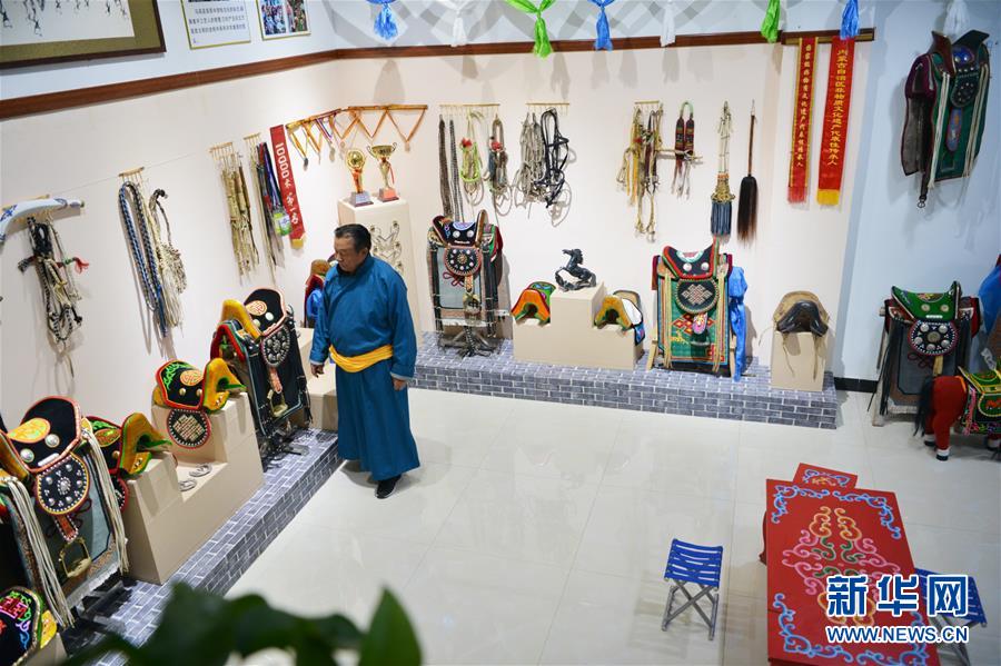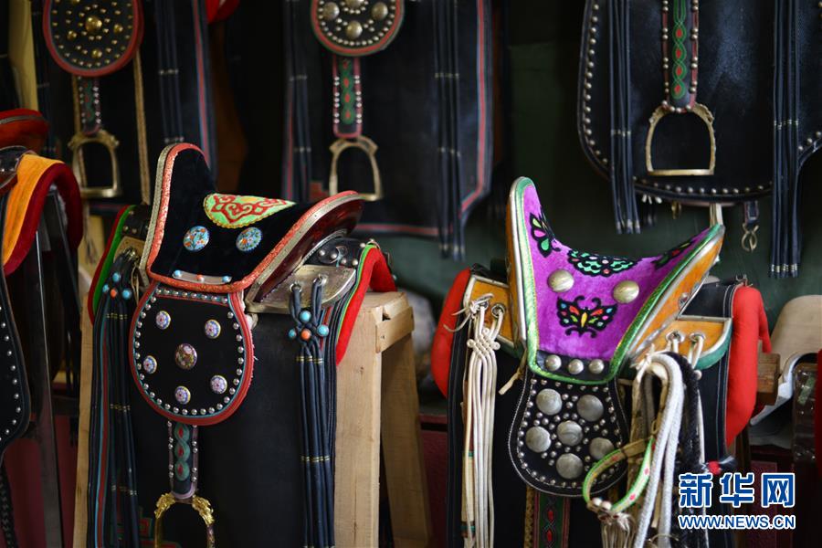 這是10月30日在內(nèi)蒙古自治區(qū)通遼市科爾沁左翼后旗拍攝的套格敦白乙制作的馬鞍。新華社記者鄒予攝