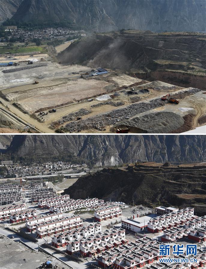 這是一張拼版照片。上圖為:隴南市武都區(qū)坪埡藏族鄉(xiāng)易地扶貧搬遷項目建設現(xiàn)場(2016年9月1日攝);下圖為:同一角度拍攝的隴南市武都區(qū)坪埡藏族鄉(xiāng)易地扶貧搬遷項目現(xiàn)場(10月31日攝)。新華社記者 范培珅攝