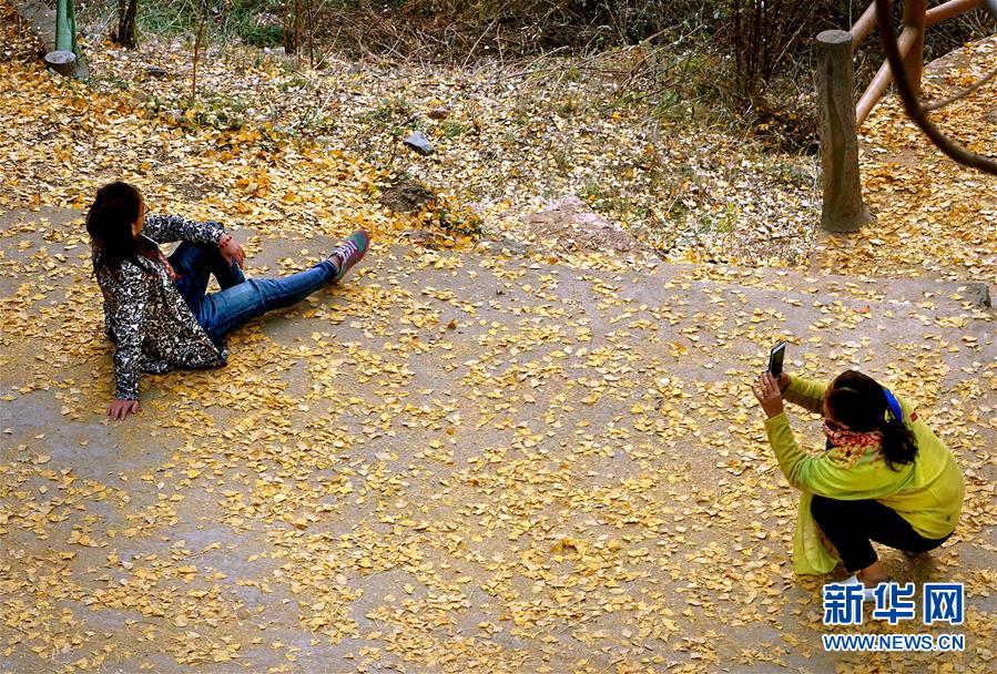 11月1日,游客在河南省嵩縣白河鄉(xiāng)下寺村古銀杏樹下拍照。 深秋時節(jié),河南省嵩縣白河鄉(xiāng)下寺村的古銀杏林為小山村披上了“金甲”。漫天黃葉,遍地金色,一幢幢民居掩映在色彩斑斕的世界里,美不勝收,吸引了眾多游客賞景拍照。 新華社記者 李安 攝