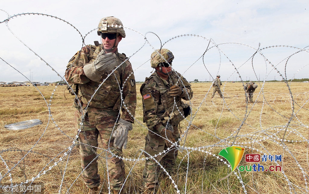 美國士兵部署美墨邊境點,鋪設(shè)鐵絲網(wǎng)應(yīng)對移民大軍壓境。