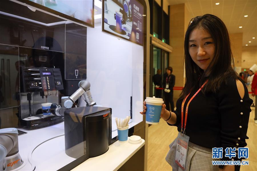 11月4日,一位媒體記者在首屆中國國際進(jìn)口博覽會新聞中心無人咖啡亭品嘗咖啡。 新華社記者 劉大偉 攝