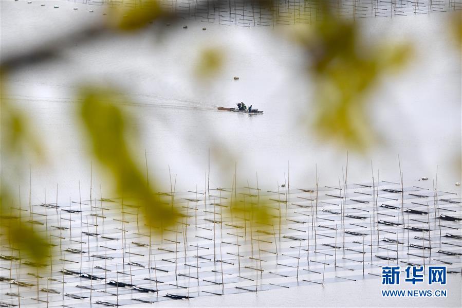 11月4日,漁船行駛在霞浦縣三沙鎮(zhèn)的紫菜種植區(qū)。 近日,福建省霞浦縣沿海6萬畝紫菜迎來收獲季節(jié),漁民們出海收獲紫菜,海上田園一派繁忙豐收景象。 新華社記者 姜克紅 攝