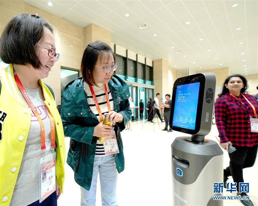 11月4日,媒體記者在首屆中國(guó)國(guó)際進(jìn)口博覽會(huì)新聞中心和引導(dǎo)機(jī)器人互動(dòng)。 新華社記者陳建力攝