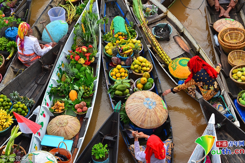 數(shù)以百計的小販們乘坐小船聚集在水上集市,出售他們親手采摘的新鮮果實和蔬菜,他們的衣著和貨物融合出令人驚嘆的色彩盛宴。 圖片來源:視覺中國