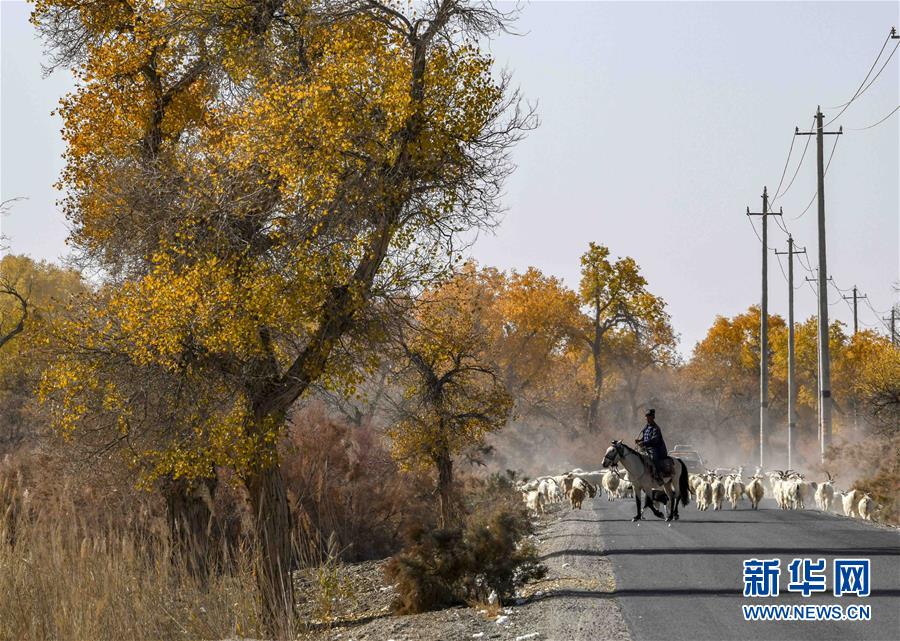 在新疆尉犁縣喀爾曲尕鄉(xiāng),牧羊人馬木提·買買提在胡楊邊上的道路上牧羊(10月25日攝)。 10月中下旬,靜靜的塔里木河中下游一片金黃。胡楊深處,條條小路蜿蜒綿長通向遠方,引人入勝。 塔里木河是中國最長的內(nèi)陸河,這一區(qū)域原始胡楊林分布較為集中。隨著塔里木河連續(xù)19次向下游生態(tài)輸水,為胡楊林“解渴”,塔河兩岸生態(tài)得到明顯改善,沙地面積逐年減少。 新華社記者趙戈攝