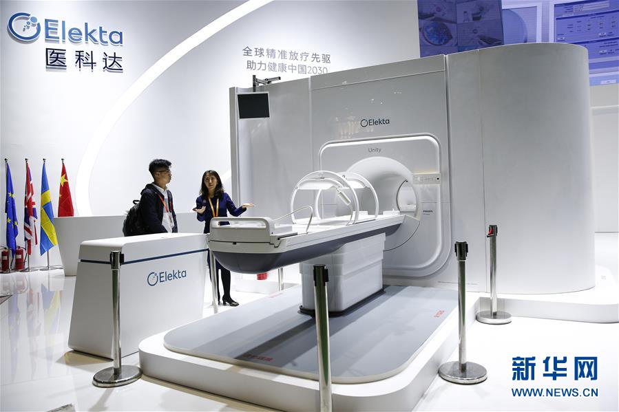 11月6日,瑞典醫(yī)科達(dá)公司工作人員為一名記者介紹高場強(qiáng)磁共振放療系統(tǒng)Elekta Unity。該款診斷級磁共振成像系統(tǒng)與先進(jìn)的放療加速器有機(jī)結(jié)合,可以在腫瘤放療治療的過程中實(shí)時(shí)、高分辨率地顯示和追蹤腫瘤的變化。 新華社記者 張玉薇 攝