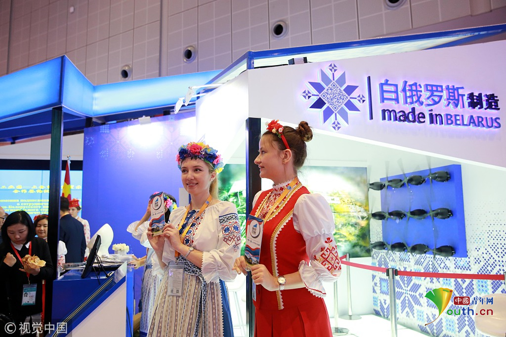2018年11月6日,上海,首屆中國國際進(jìn)口博覽會國家展上,共有82個(gè)國家、3個(gè)國際組織設(shè)立了71個(gè)展臺。白俄羅斯館。視覺中國