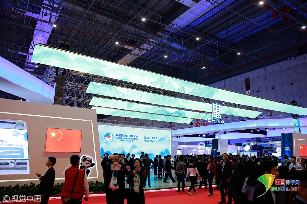 2018年11月6日,上海,首屆中國國際進(jìn)口博覽會國家展上,共有82個(gè)國家、3個(gè)國際組織設(shè)立了71個(gè)展臺。中國館。視覺中國