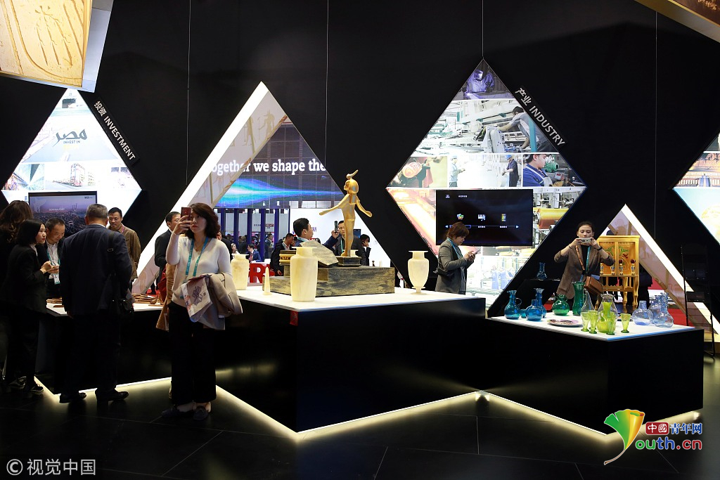 2018年11月6日,上海,首屆中國國際進(jìn)口博覽會國家展上,共有82個(gè)國家、3個(gè)國際組織設(shè)立了71個(gè)展臺。埃及館。視覺中國