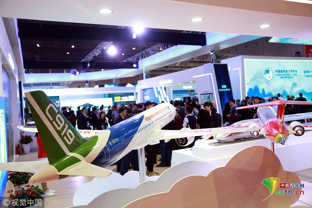 2018年11月6日,上海,首屆中國國際進(jìn)口博覽會國家展上,共有82個(gè)國家、3個(gè)國際組織設(shè)立了71個(gè)展臺。中國館展示的C919飛機(jī)。視覺中國