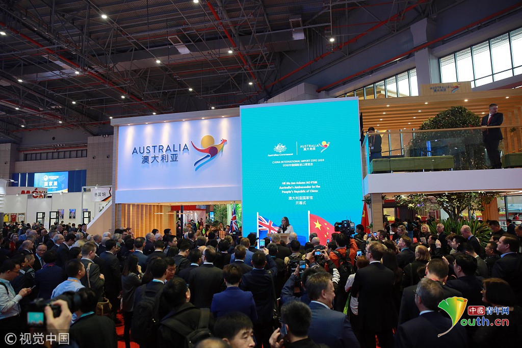 2018年11月6日,上海,首屆中國國際進(jìn)口博覽會國家展上,共有82個(gè)國家、3個(gè)國際組織設(shè)立了71個(gè)展臺。澳大利亞館新產(chǎn)品、新技術(shù)發(fā)布。視覺中國