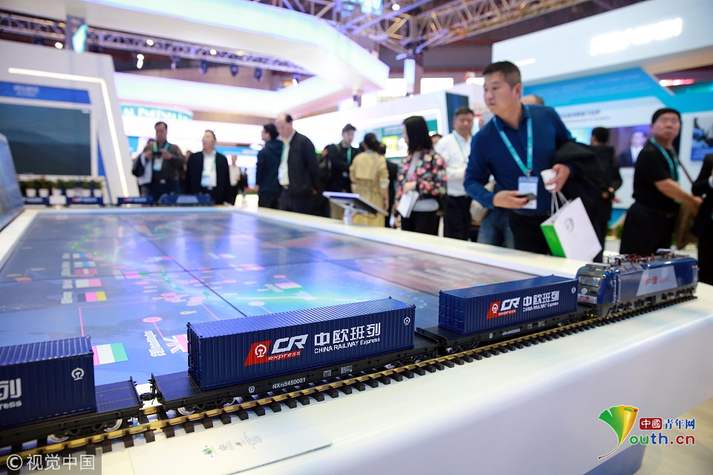 2018年11月6日,上海,首屆中國國際進(jìn)口博覽會國家展上,共有82個(gè)國家、3個(gè)國際組織設(shè)立了71個(gè)展臺。中國館展示的中歐班列。視覺中國