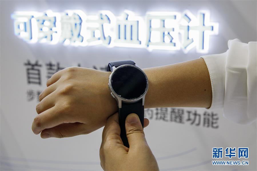 11月6日,日本歐姆龍公司工作人員在展示厚度僅25毫米的可穿戴式血壓計(jì)。 新華社記者 張玉薇 攝