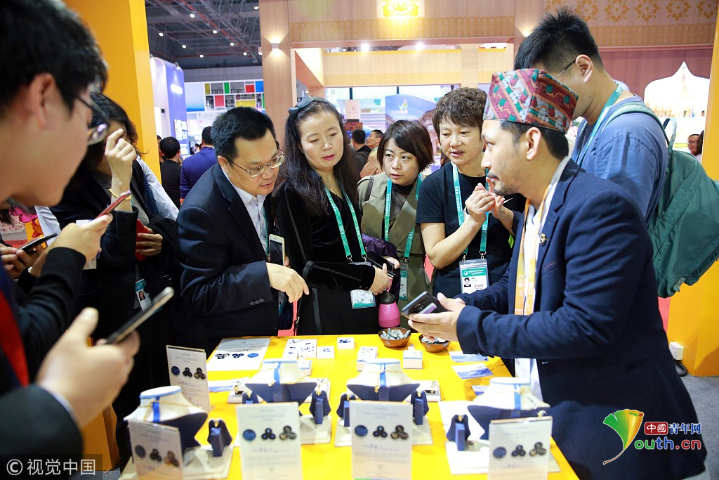 2018年11月6日,上海,首屆中國國際進(jìn)口博覽會國家展上,共有82個(gè)國家、3個(gè)國際組織設(shè)立了71個(gè)展臺。尼泊爾館。視覺中國