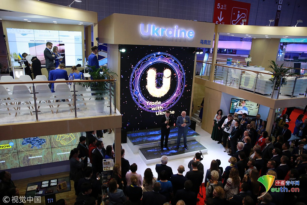 2018年11月6日,上海,首屆中國國際進(jìn)口博覽會國家展上,共有82個(gè)國家、3個(gè)國際組織設(shè)立了71個(gè)展臺。烏克蘭館新產(chǎn)品、新技術(shù)發(fā)布。視覺中國