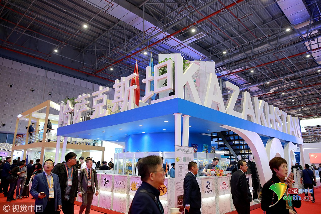 2018年11月6日,上海,首屆中國國際進(jìn)口博覽會國家展上,共有82個(gè)國家、3個(gè)國際組織設(shè)立了71個(gè)展臺。哈薩克斯坦館。視覺中國
