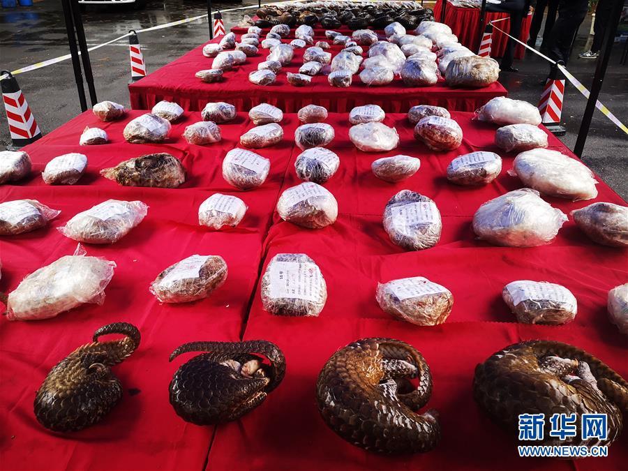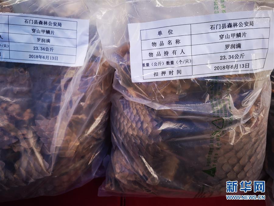 11月6日,湖南省林業(yè)局舉行“4.26”特大非法收購、運(yùn)輸、出售珍貴、瀕危野生動物及其制品案發(fā)布會。據(jù)介紹,案件共刑事拘留犯罪嫌疑人129名,收繳穿山甲實體216只、穿山甲鱗片66公斤、藏羚羊角20只、其他野生動物及其制品一批,扣押贓款1800多萬元。抓捕行動一舉摧毀了一個由境外走私到廣西,由廣西運(yùn)輸至廣州市,再由廣州市向全國分銷的穿山甲非法貿(mào)易網(wǎng)絡(luò)。新華社記者周勉攝