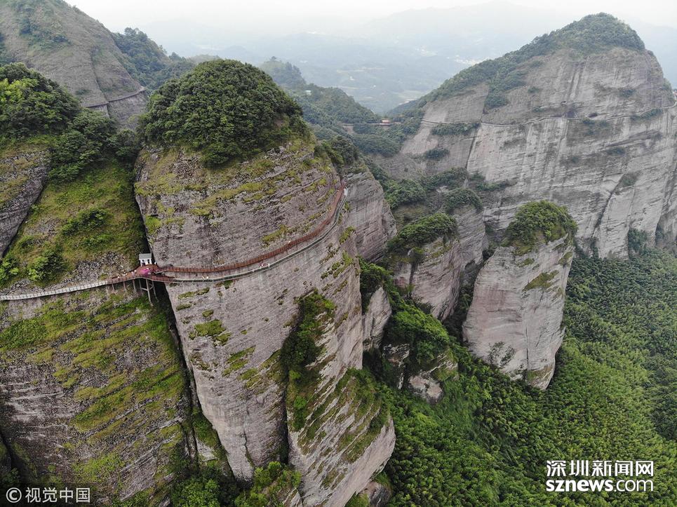 深圳新聞網(wǎng)訊 2018年6月19日,航拍江西贛州南武當(dāng)山百米高空玻璃棧道。棧道緊貼峭壁,在懸崖之上凌空蜿蜒穿行,猶如一條玉龍盤旋在綠林石海之中。 南武當(dāng)山位于江西最南端的龍南縣武當(dāng)鎮(zhèn)境內(nèi),景區(qū)核心面積達(dá)到13.5平方公里,擁有99座千姿百態(tài)的巍峨石峰,丹霞地質(zhì)風(fēng)貌突出,連綿十里,被稱為“武當(dāng)十里畫(huà)廊”。