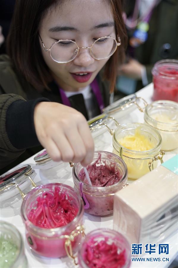 11月7日,在進(jìn)博會(huì)食品及農(nóng)產(chǎn)品展區(qū)的一家俄羅斯企業(yè)展位,一名參觀者品嘗混合純天然果汁的蜂蜜產(chǎn)品。 新華社記者 沈伯韓 攝