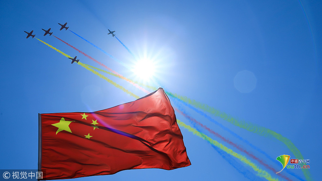 2018年11月8日,廣東珠海,第十二屆中國(guó)國(guó)際航展第三天??哲姟鞍艘弧憋w行表演隊(duì)的隊(duì)員們,發(fā)揚(yáng)連續(xù)作戰(zhàn)精神,給觀眾們表演了七機(jī)分組開花、四機(jī)編隊(duì)橫滾等高難動(dòng)作,受到觀眾們的稱贊。視覺中國(guó)