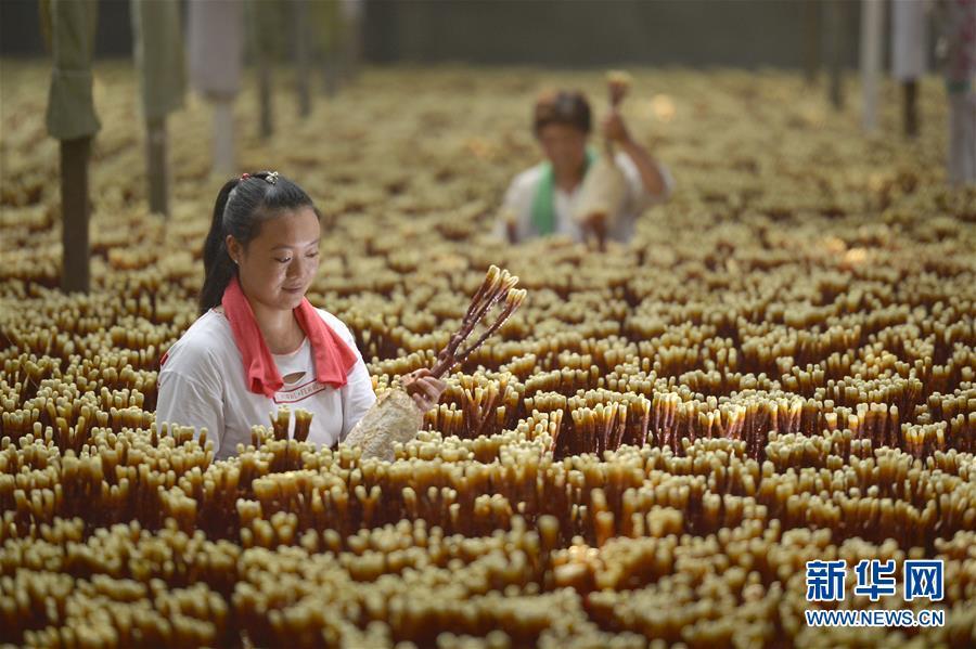 8月22日,河北省沙河市蟬房鄉(xiāng)水磨頭村農(nóng)民在大棚內(nèi)修剪靈芝。 新華社記者 牟宇 攝
