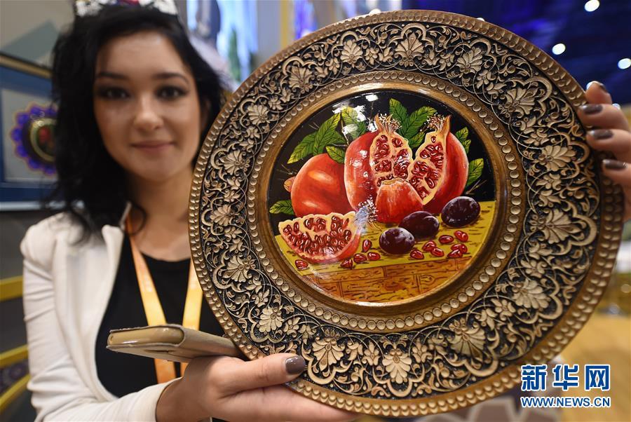 11月8日,烏茲別克斯坦參展人員展示手工制作的核桃木工藝品。 新華社記者 韓瑜慶 攝