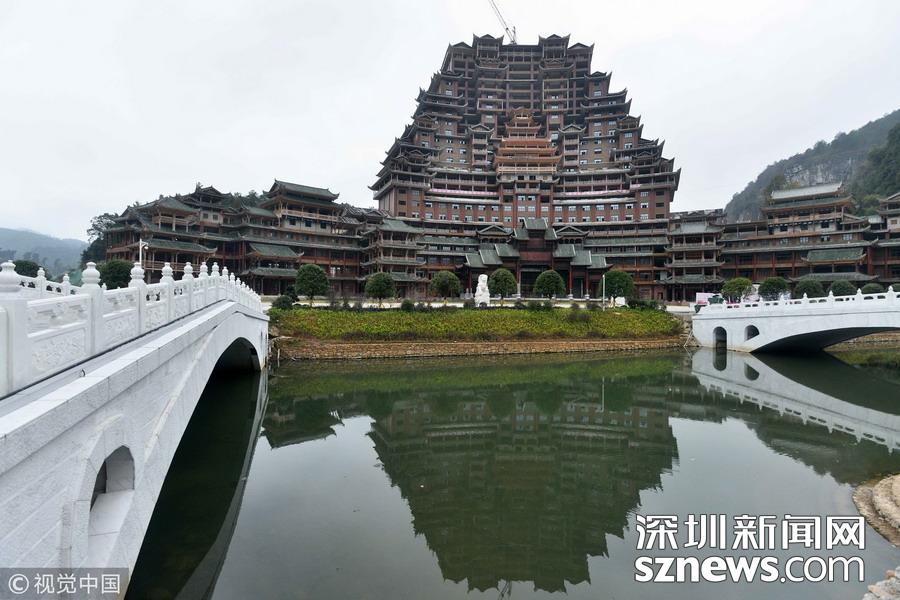 深圳新網(wǎng)網(wǎng)訊 始建于2016年9月的貴州省獨山縣水司樓已進入工程收尾階段。雄偉壯麗造型別致的水司樓,是集會展博覽、酒店住宿、游覽觀光等于一體的大型綜合體。除具有水族特色元素外,該建筑還融合了苗族、布依族特色,是獨山縣凈心谷景區(qū)最具標志性的宏大建筑。該樓占地面積5900平方米,總建筑面積60000平方米,樓高99.9米,共24層,是世界上最高大最大最壯觀的水族建筑,被稱為“天下第一水司樓”。 水司樓是按照水族依山畔水而居的傳統(tǒng)習俗和建筑特征修建,是水族人民的文化符號和智慧的象征,背靠凈心河谷山脊,以弧形的平面布局模式,如同張開懷抱的巨人,緊擁美麗的姻脂河灣,設(shè)計巧妙,工藝精巧。