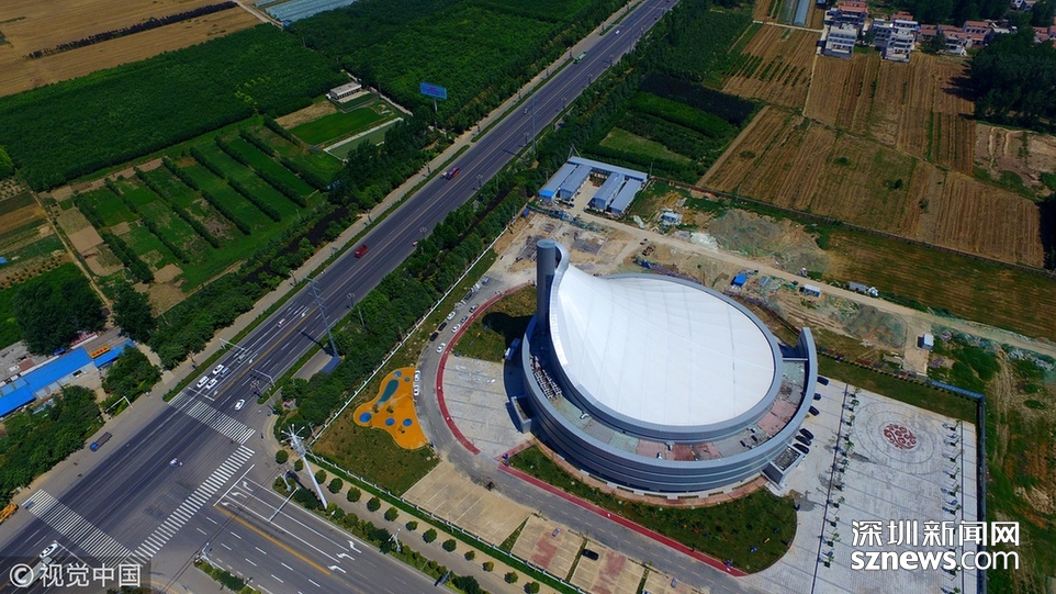 2018年6月13日,航拍河南淮陽一座即將竣工落成的體育場館建筑,市民稱酷似一個(gè)石磨盤。