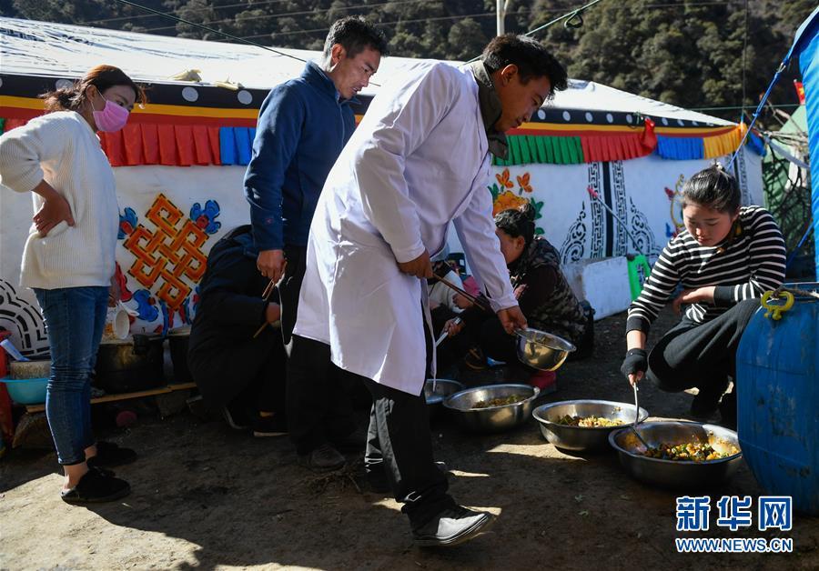 11月12日,在西藏昌都市江達(dá)縣波羅鄉(xiāng)康扎西安置點,工作人員在臨時廚房打飯。 西藏自治區(qū)江達(dá)縣波羅鄉(xiāng)康扎西安置點,離波羅鄉(xiāng)政府直線距離約3公里,位于一處地勢開闊平緩的山谷中,比堰塞湖水面高出100多米。10月11日金沙江白格段山體滑坡發(fā)生后,當(dāng)?shù)鼐驮谶@里設(shè)立了安置點,安置附近受災(zāi)群眾。 新華社記者 劉東君 攝