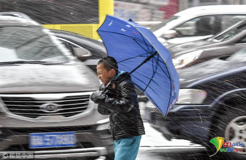 2018年11月12日,持續(xù)濃霧天氣的新疆烏魯木齊市,又迎來(lái)一場(chǎng)雨雪天氣,氣溫隨之驟降。圖為一名男孩打著雨傘與風(fēng)雪“抗?fàn)帯?。圖片作者:劉新