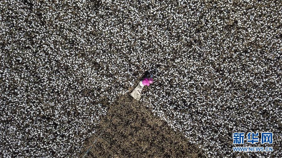 陳喜波的表嫂宋仙在新疆巴楚縣多來提巴格鄉(xiāng)卡扎尼塔皮提村的棉田中拾花(10月25日無人機(jī)拍攝)。