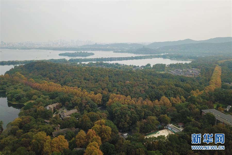 11月13日無人機(jī)拍攝的杭州西湖一景。 時(shí)值初冬,杭州市西湖景區(qū)層林盡染,色彩斑斕,別有一番韻味。