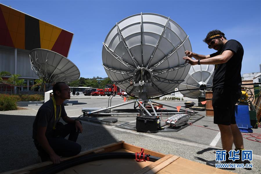 11月13日,工作人員在巴布亞新幾內(nèi)亞首都莫爾茲比港的APEC國際媒體中心安裝衛(wèi)星設備。 新華社記者呂小煒攝