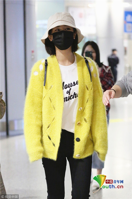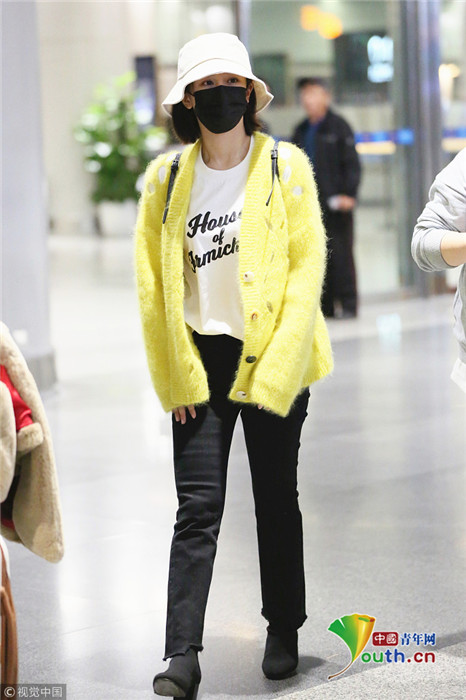 日前,楊紫現身長沙黃花機場,她頭戴漁夫帽的她口罩遮面,身著鮮黃針織衫相當搶眼,一路獲粉絲跟拍。