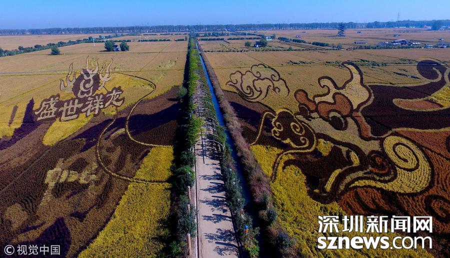 遼寧沈陽,金秋時(shí)節(jié),沈陽盛世祥龍、千手觀音、孔子、厲害啦我的國、求婚等主題總面積680畝、共15幅具有3D效果的巨幅稻田畫迎來最佳觀賞期。